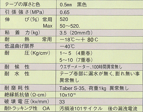 耐候性、耐オゾン性に優れ、各種電線、ケープルの絶縁被覆、末端処理、補修などに使用される。テープの構造及び使用と特性: