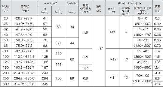 1.6MPa~0.8MPa、水、温水、薬液、油 0.5MPa 気体空気 ※カップリング直近部で必ず配管固定をしてください。 |