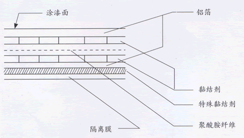 铝箔压在聚酸胺纤维编制物的上面形成薄片叠层结构。在一面使用黏结剂和由一层隔离膜覆盖。